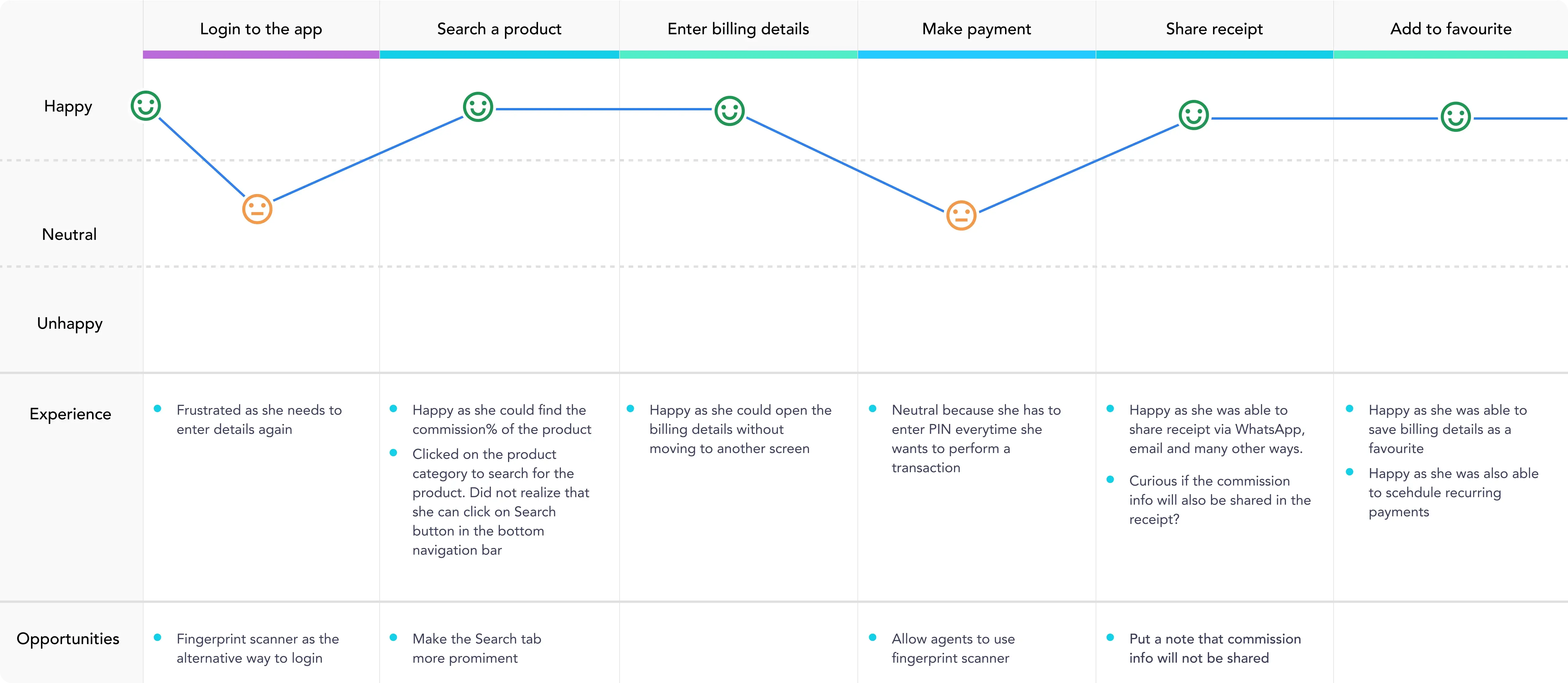 During usability testing, I created User Journey Maps to capture the user experiences while interacting with the low-fidelity prototype. This exercise revealed opportunities for enhancing our app experience.