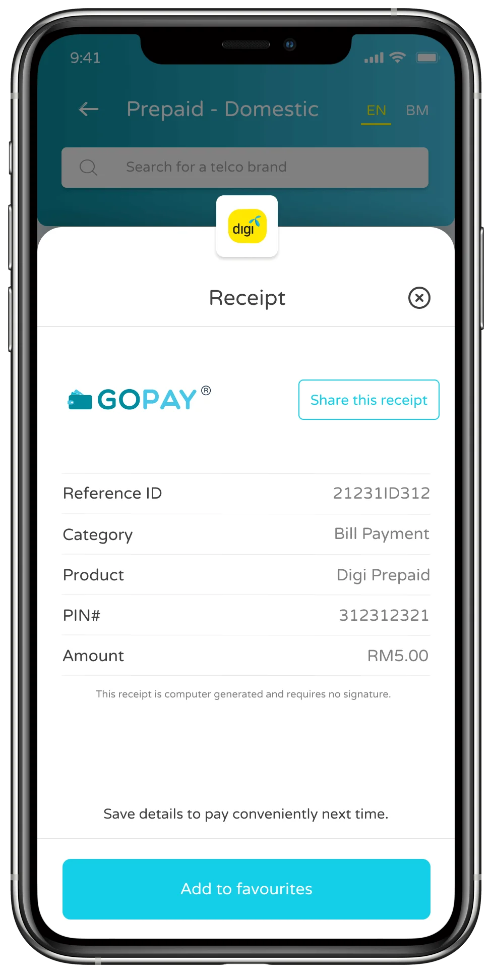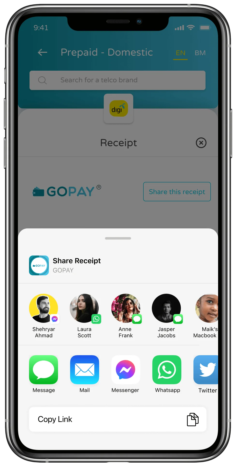 Share receipt via social sharing.